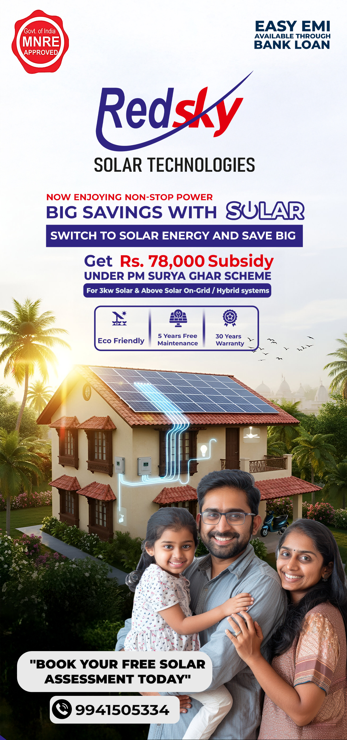 We are a leading solar solutions provider in Chennai, specializing in residential, commercial, and industrial solar installations. With a commitment to sustainability, we deliver high-quality solar solutions using Adani Solar, Premier Energies, Polycab On-Grid Inverters, and Deye Hybrid Inverters.